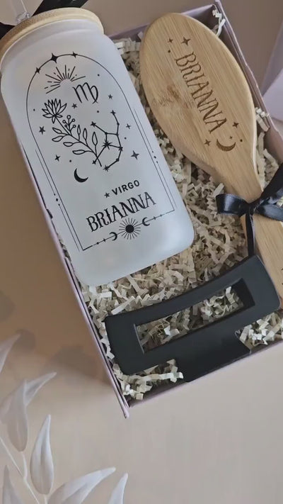 A personalized zodiac gift box featuring a frosted glass tumbler, matching bamboo brush, and a hand-poured candle—curated to feel magical, calming, and gift-ready. Choose her sign and candle scent, add her name, and we’ll create a keepsake self-care moment she’ll love.