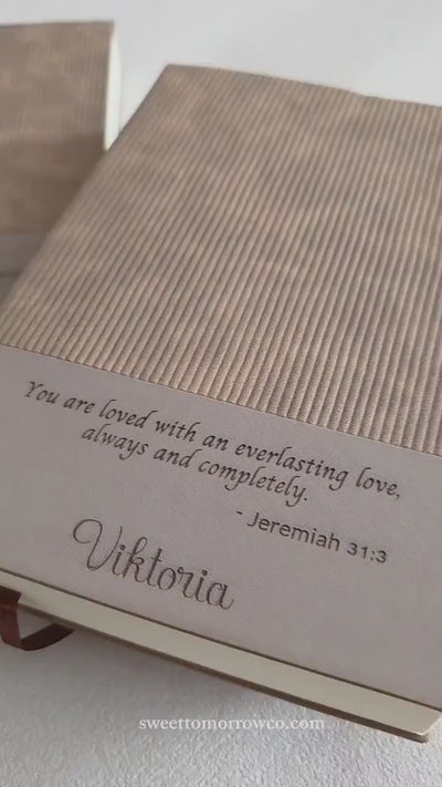 A timeless personalized Bible verse journal designed for quiet moments with God. Neutral ribbed cover, engraved Scripture, and custom name make this the perfect Christian gift for women, teen girls, and friends who love journaling, prayer, and Bible study.