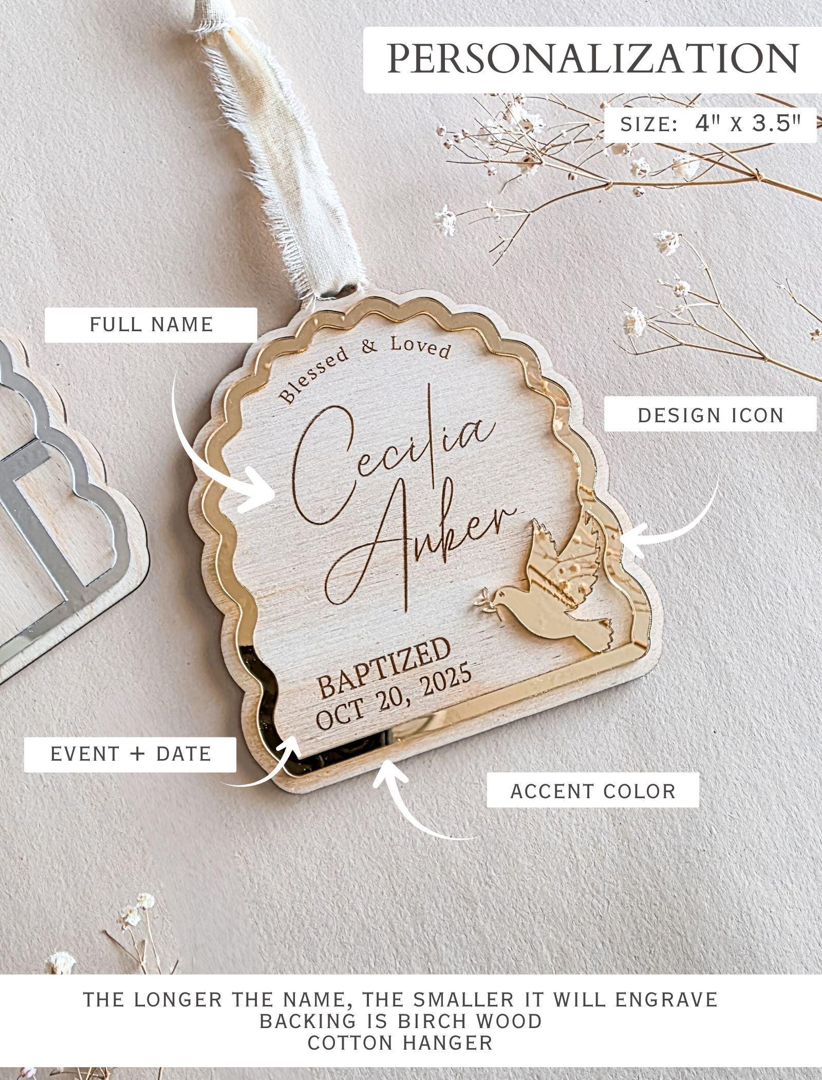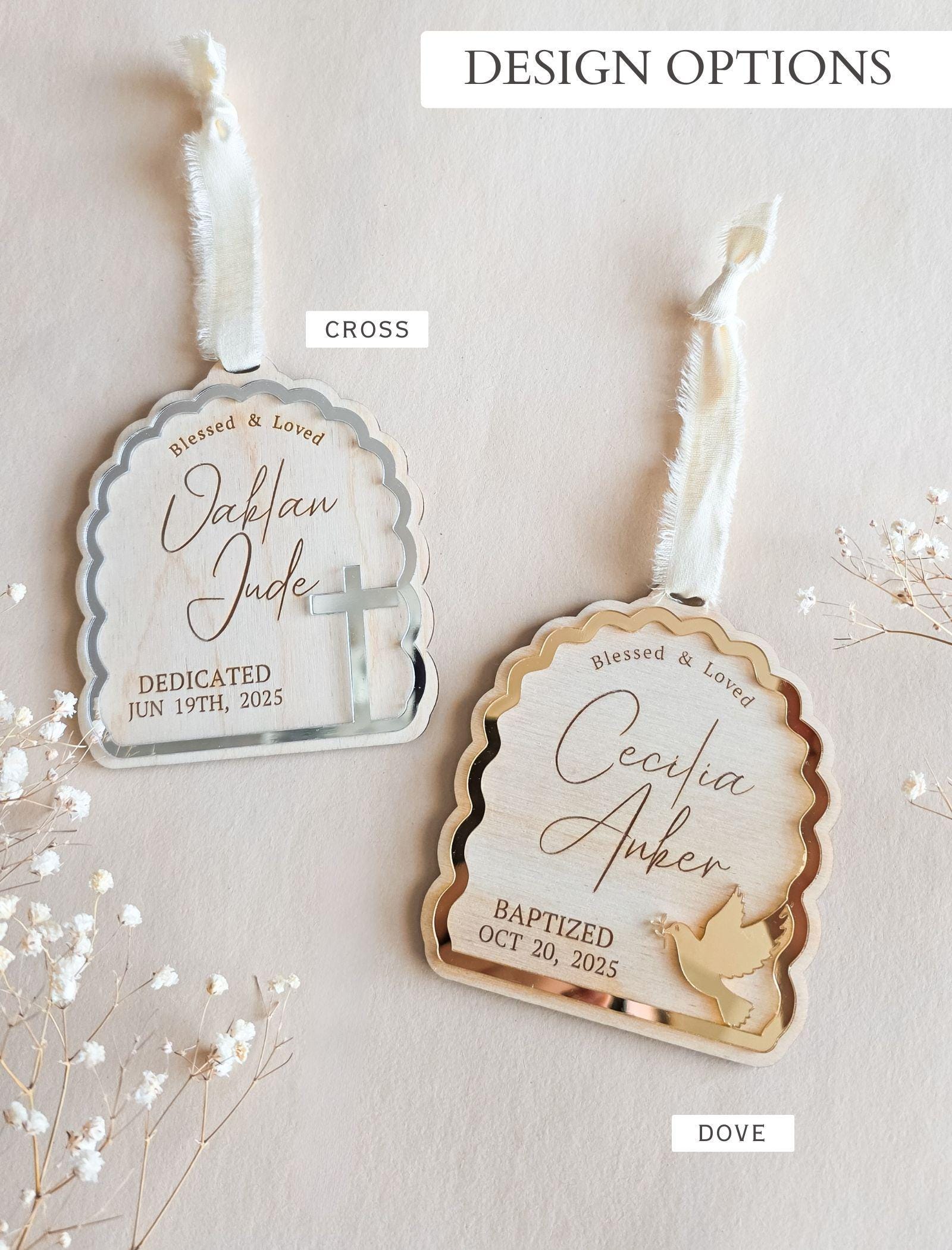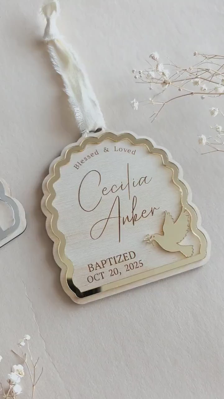 Celebrate a special faith milestone with a personalized baptism or dedication ornament. Made from wood with a gold or silver mirrored frame, this keepsake is customized with the childโs name and date, making it a meaningful gift for boys, girls, or adults. Perfect for Christmas trees, godparent gifts, and treasured family keepsakes.