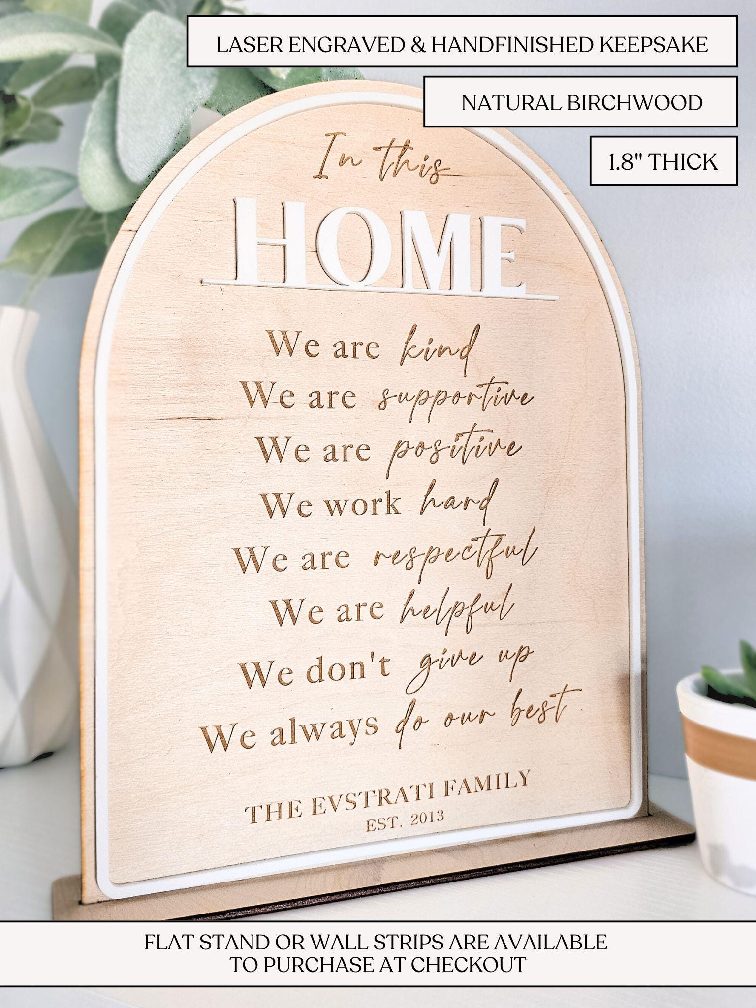 This Family Name Established Sign is a stunning piece of wooden wall art that serves as inspirational home decor for any family. Crafted from arched birchwood, this personalized family rule display not only showcases your family's values but also makes for a thoughtful and unique housewarming gift. Made by a mom as well =)
