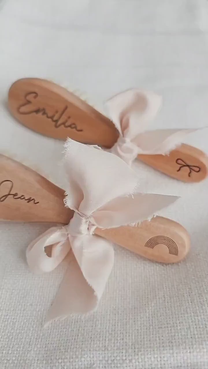 A sweet everyday keepsake for baby—an engraved wooden hairbrush with soft bristles, personalized with their name (and an optional symbol). Choose brush only or the full gift set with a matching keepsake box for baby showers, baptisms, and first memories.