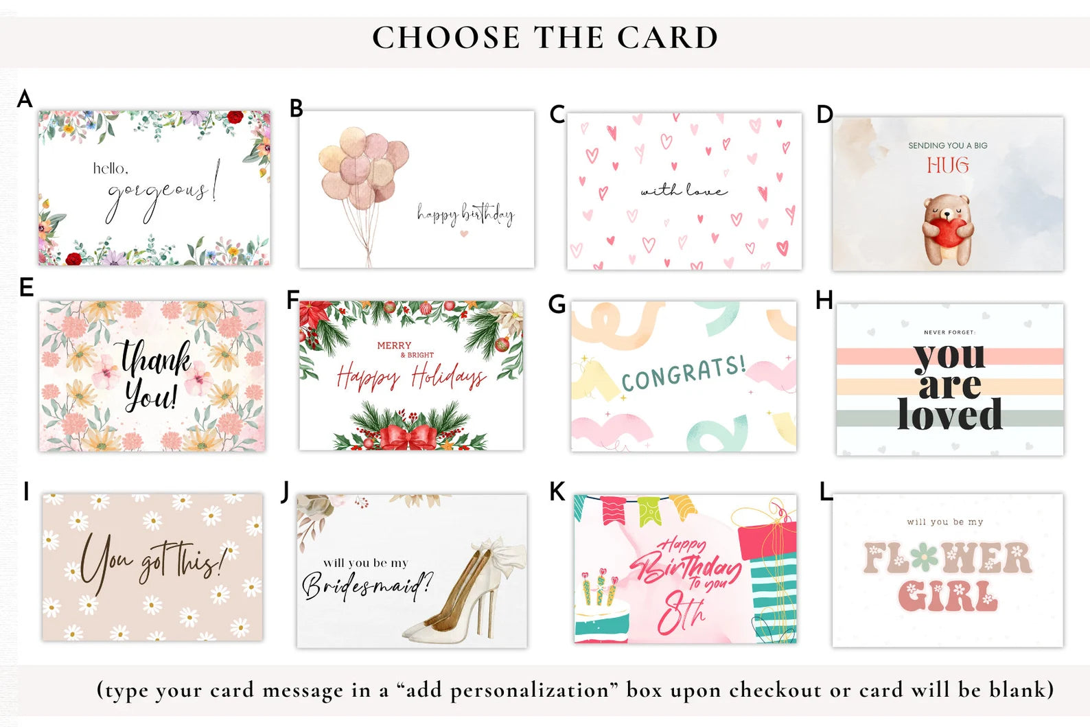 โข card of your choice (if you want a special message on the card, please leave your message at checkout in a personalization box)